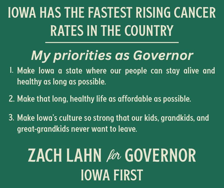 4. Rising Cancer Rates: This is personal. As a 2x cancer survivor at only 35, I know something is terribly wrong. Iowa has the 2nd highest cancer rate in the US. Zach is standing up to Big Ag & Big Pharma to demand accountability for the toxins poisoning our families. 🎗️